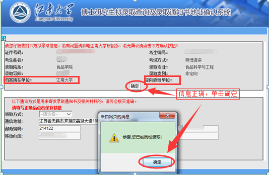 录取类别为“非定向”的考生,需确认报名时所填写的 “档案所在单位”名称是否正确,否则可能影响调档;录取类别为“定向”的考生需确认“定向委培单位”名称。如信息有误,请将更正信息发送到:yzb@jiangnan.edu.cn,邮件请标注“xxx博士信息变更(档案所在单位)”或 “xxx博士信息变更(定向委培单位)”。