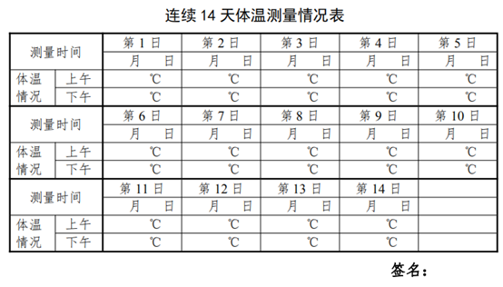 (二)入学前连续14天每日监测体温并填写体温测量情况表。