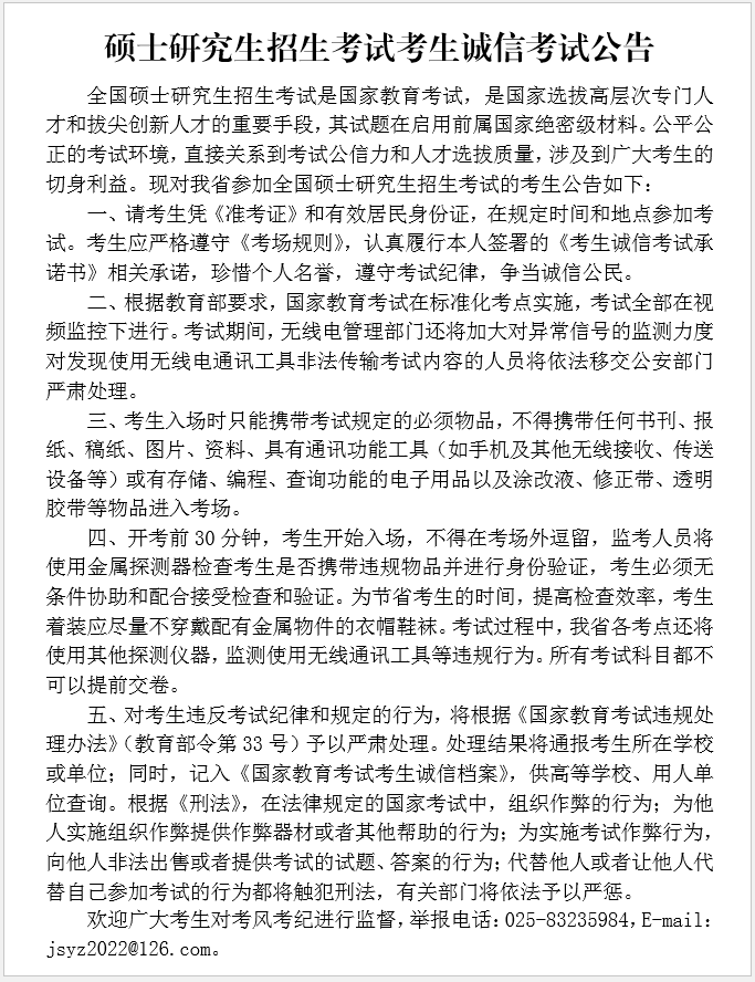 1.考生须按要求提前下载和签署《江苏省2022年全国硕士研究生招生考试健康应试承诺书》,于第一场开考前交所在考场监考老师。