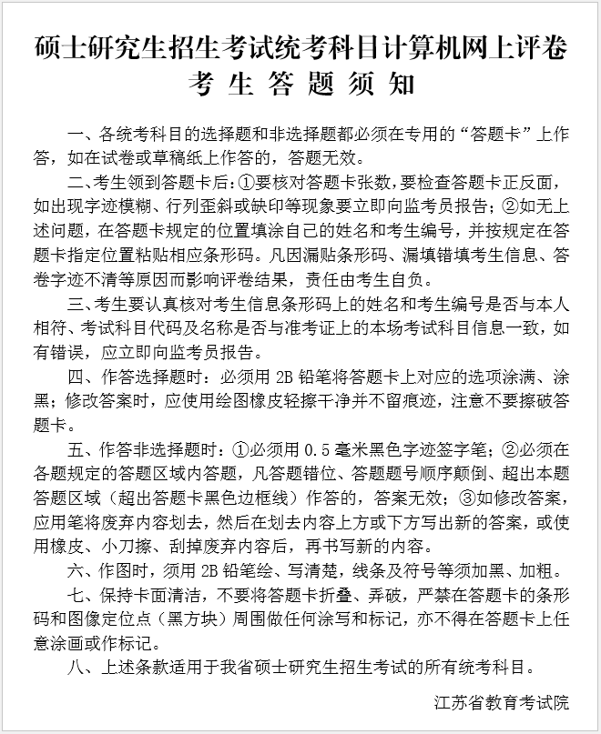 考生应提前了解江苏省教育考试院发布的《硕士研究生招生考试统考科目计算机网上评卷考生答题须知》,按要求进行统考科目答题卡的填写。