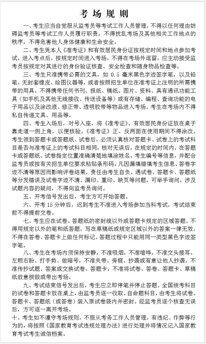 提醒:考生至少提前1小时到达考点,每场考试开考前30分钟,考生凭准考证和有效身份证件有序进入考场,开考15分钟后迟到考生不得进入考场,考试结束前不得提前交卷。