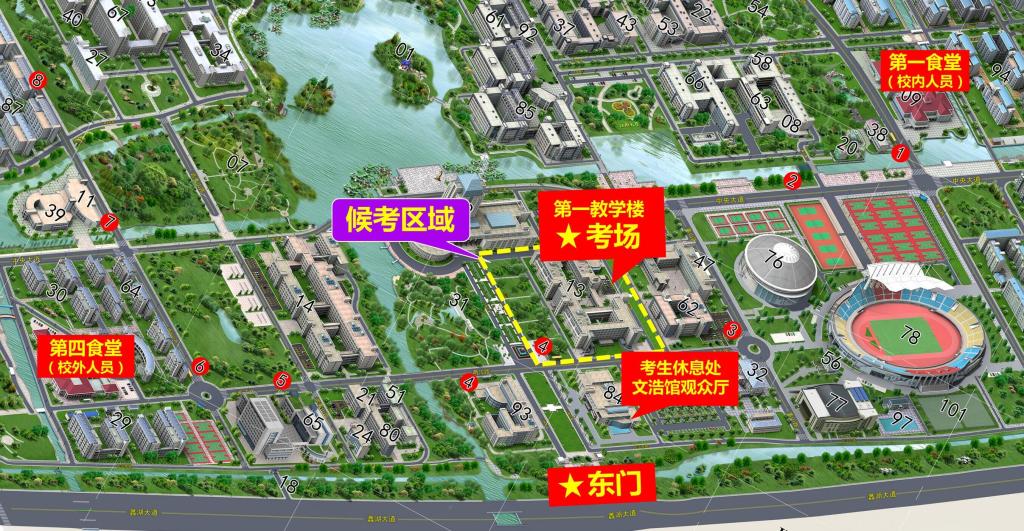 1.就餐休息。12月20、21日中午,学校在第四食堂二楼设置校外考生用餐专区,校外考生可自行购买餐券用餐;学校还将开放文浩馆观众厅供考生休息。